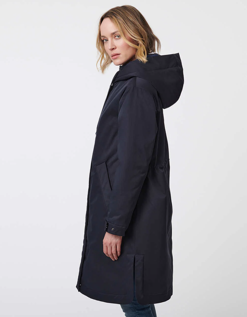 The Modern Utility Raincoat offers practicality with style for all-weather wear. With a long length, it features a two-in-one design: a removable bib with Ecoplume⢠insulation for additional warmth and an outside water-resistant layer for protection. A drawstring waist and hood ensure a customizable fit, making it ideal for staying cozy and dry during unpredictable weather.