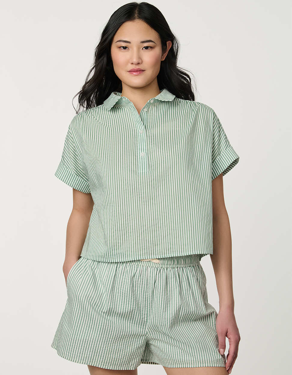 The Striped Poplin Popover Top is a modern women’s striped blouse designed for effortless style. Crafted from crisp, breathable poplin cotton, this lightweight short-sleeve top features a relaxed silhouette, refined collar, and subtle popover neckline for polished structure. The Silt Green and Bright White vertical stripe creates a fresh, elongating effect that feels both timeless and contemporary. Perfect for pairing with matching shorts or tailored trousers, this versatile striped poplin top transitions seamlessly from casual daytime wear to elevated warm-weather styling.